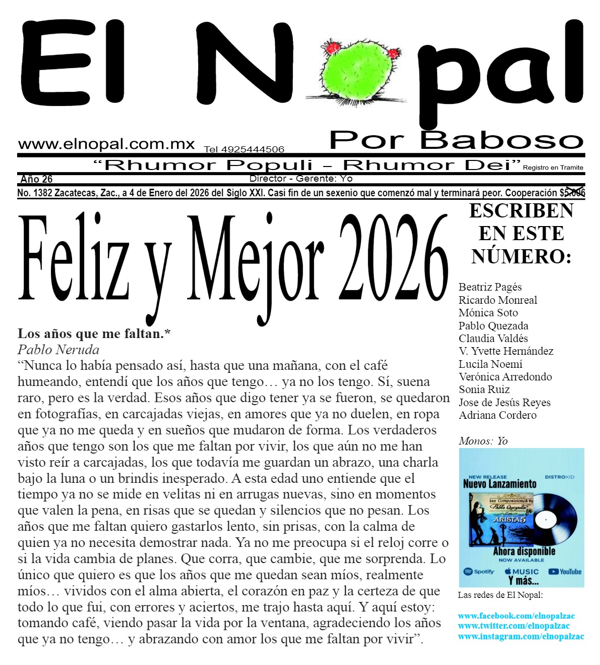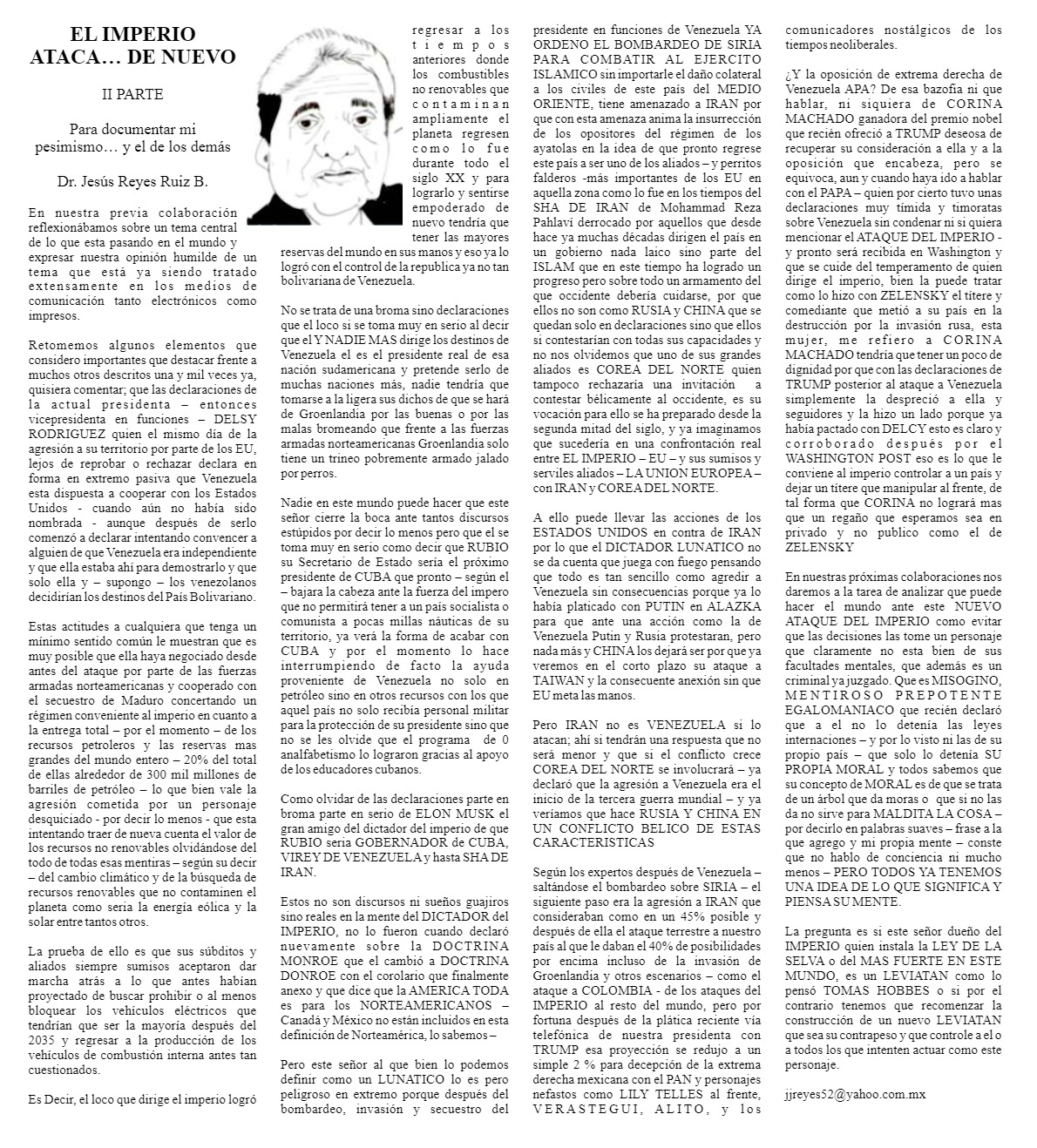 José de Jesús Reyes Ruíz EL IMPERIO ATACA… DE NUEVO II PARTE EL IMPERIO ATACA… DE NUEVO II PARTE Para documentar mi pesimismo… y el de los…El Nopal16 enero, 2026
