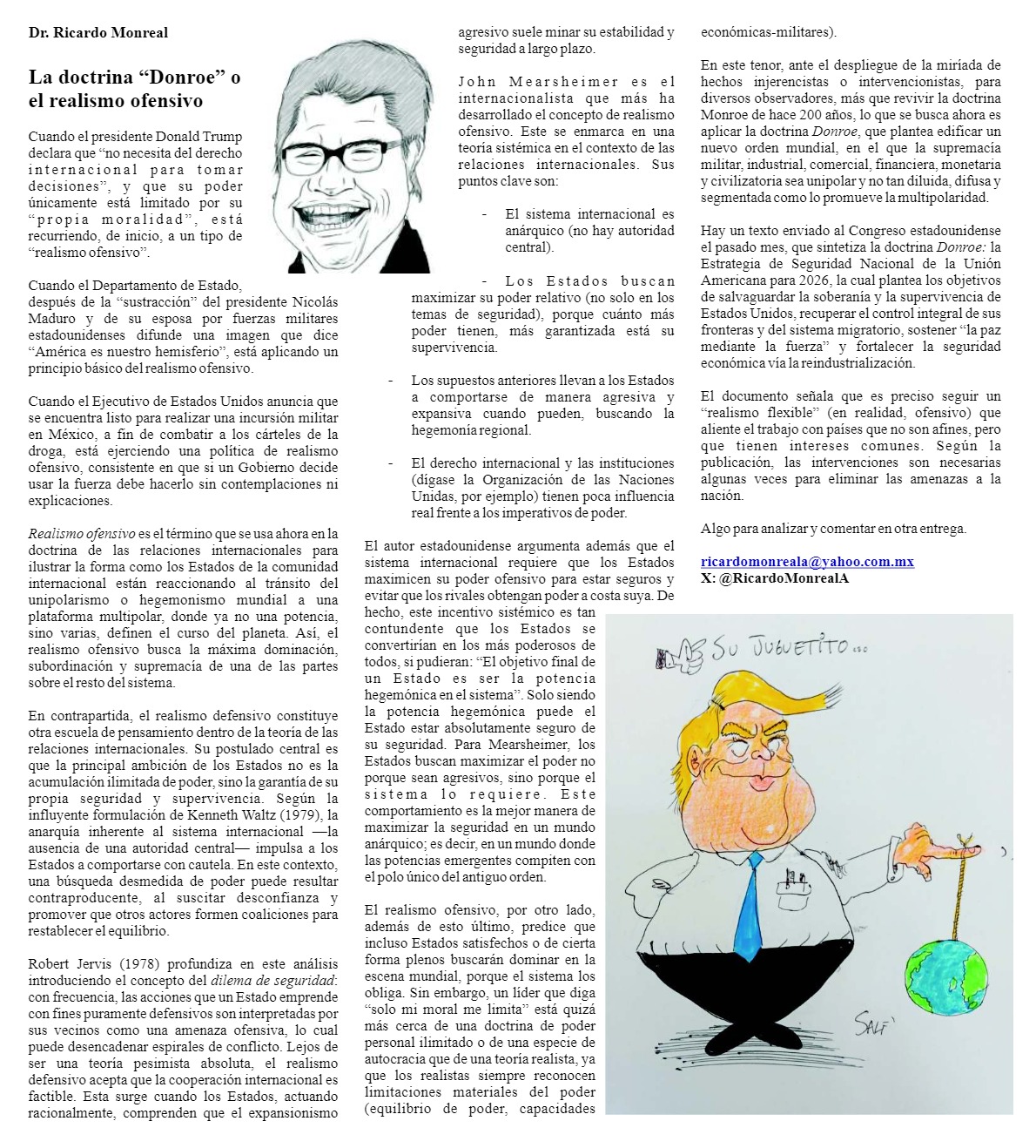 Ricardo Monreal Ávila La doctrina “Donroe” o el realismo ofensivo Dr. Ricardo Monreal La doctrina “Donroe” o el realismo ofensivo Cuando el presidente Donald Trump…El Nopal16 enero, 2026