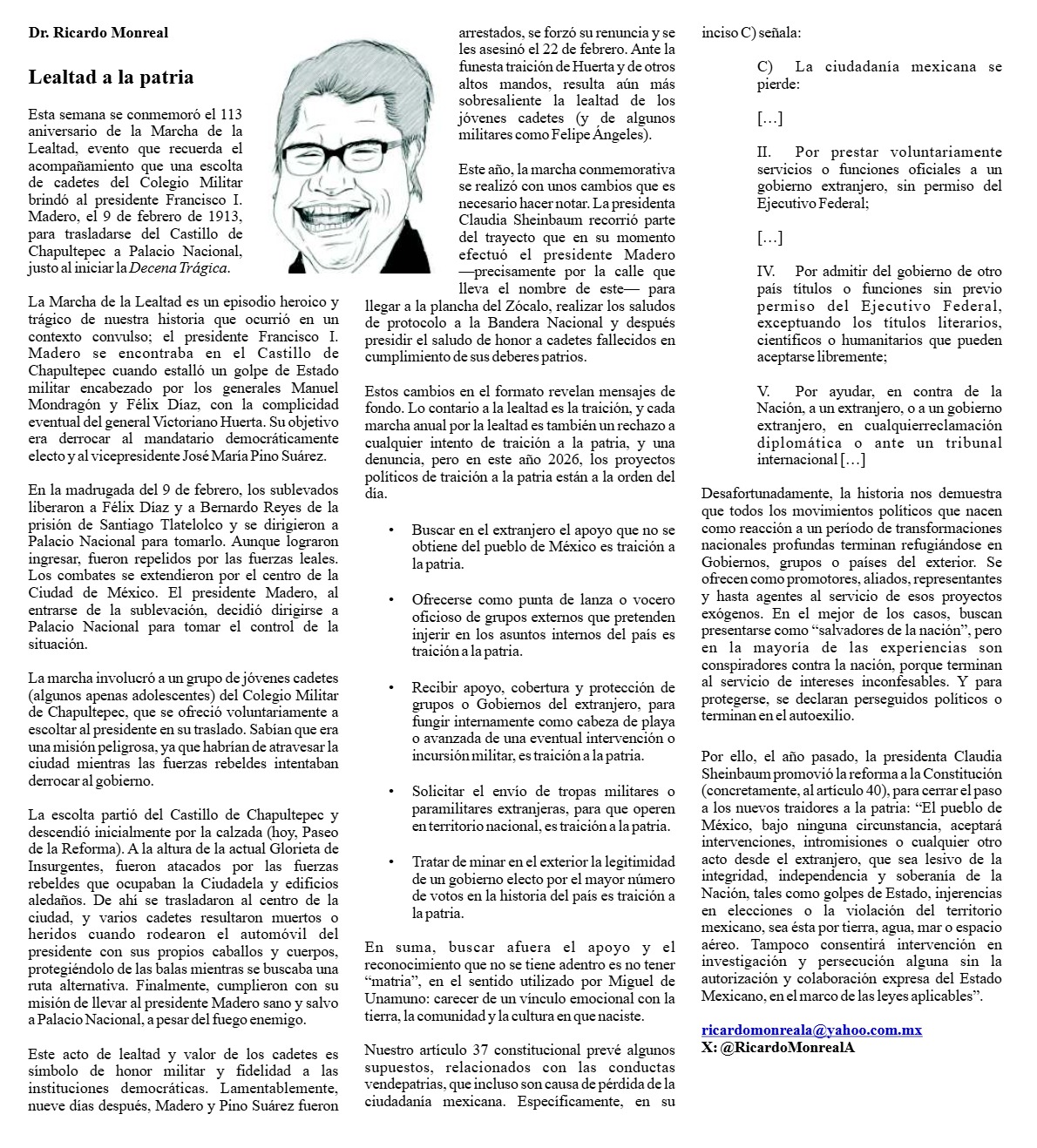 Ricardo Monreal Ávila Lealtad a la patria Dr. Ricardo Monreal Lealtad a la patria Esta semana se conmemoró el 113 aniversario de…El Nopal13 febrero, 2026
