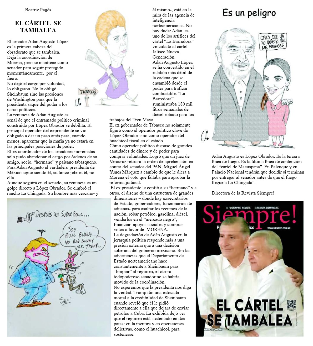 Beatriz Pagés EL CÁRTEL SE TAMBALEA Beatriz Pagés EL CÁRTEL SE TAMBALEA El senador Adán Augusto López es la primera cabeza…El Nopal13 febrero, 2026