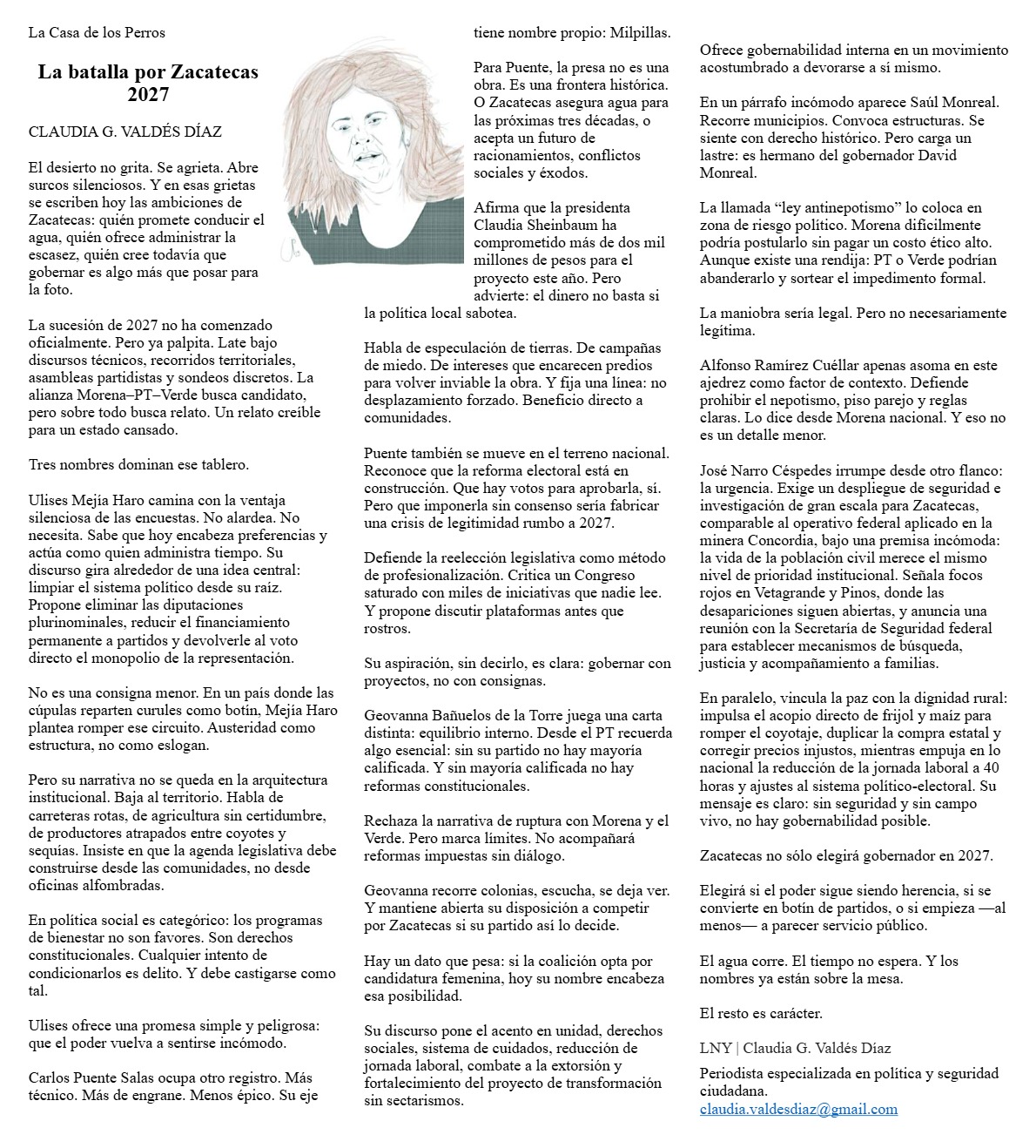 La Casa de los Perros La batalla por Zacatecas 2027 La Casa de los Perros La batalla por Zacatecas 2027 CLAUDIA G. VALDÉS DÍAZ El…El Nopal13 febrero, 2026