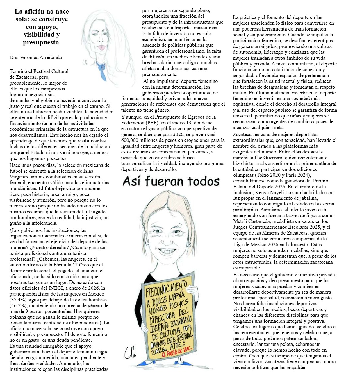 Verónica Arredondo La afición no nace sola: se construye con apoyo, visibilidad y presupuesto. La afición no nace sola: se construye con apoyo, visibilidad y presupuesto. Dra. Verónica Arredondo…El Nopal17 abril, 2026