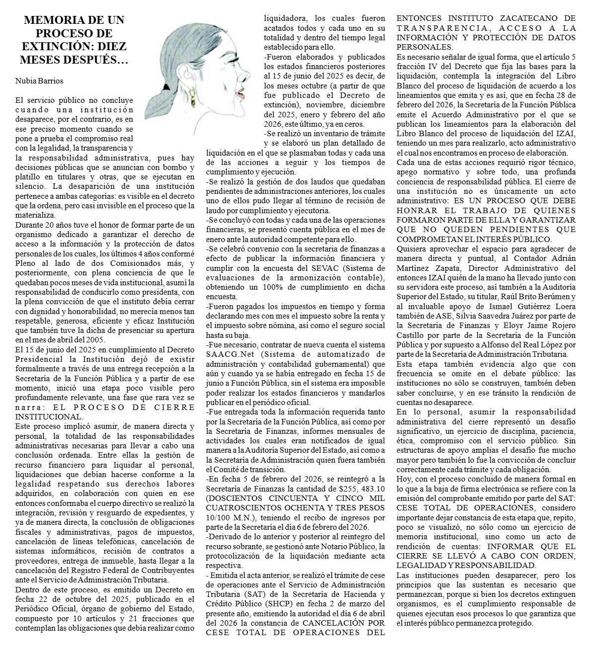 Nubia Barrios MEMORIA DE UN PROCESO DE EXTINCIÓN: DIEZ MESES DESPUÉS… MEMORIA DE UN PROCESO DE EXTINCIÓN: DIEZ MESES DESPUÉS… Nubia Barrios El servicio público no…El Nopal24 abril, 2026