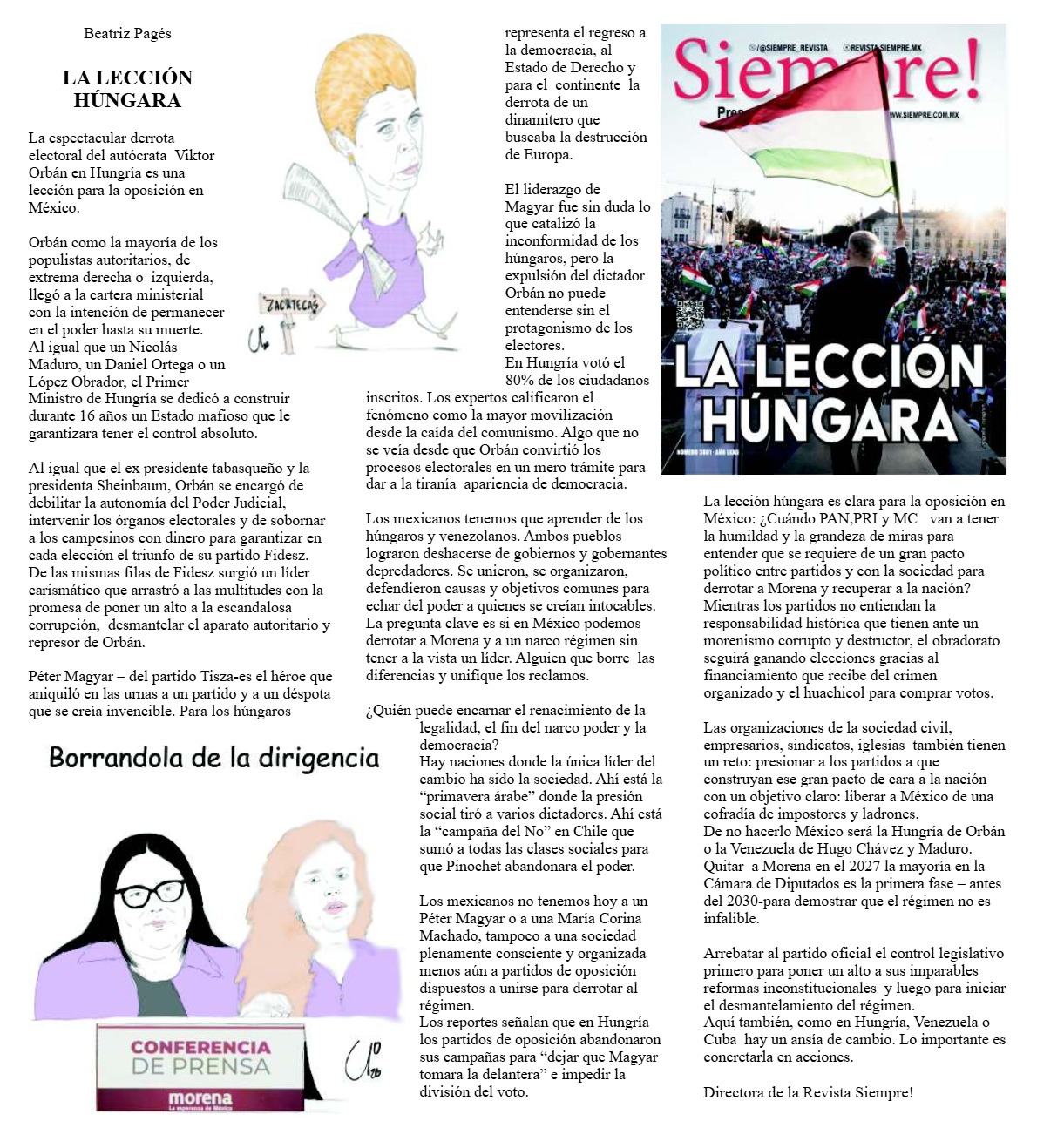 Beatriz Pagés LA LECCIÓN HÚNGARA Beatriz Pagés LA LECCIÓN HÚNGARA La espectacular derrota electoral del autócrata Viktor Orbán en Hungría…El Nopal24 abril, 2026
