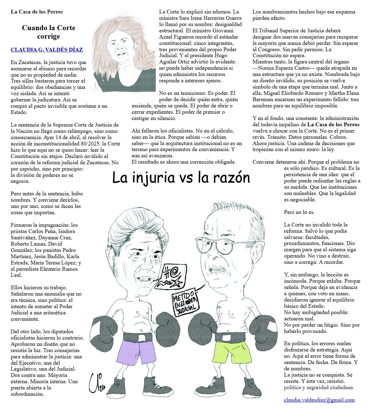 La Casa de los Perros Cuando la Corte corrige La Casa de los Perros Cuando la Corte corrige CLAUDIA G. VALDÉS DÍAZ En Zacatecas,…El Nopal24 abril, 2026